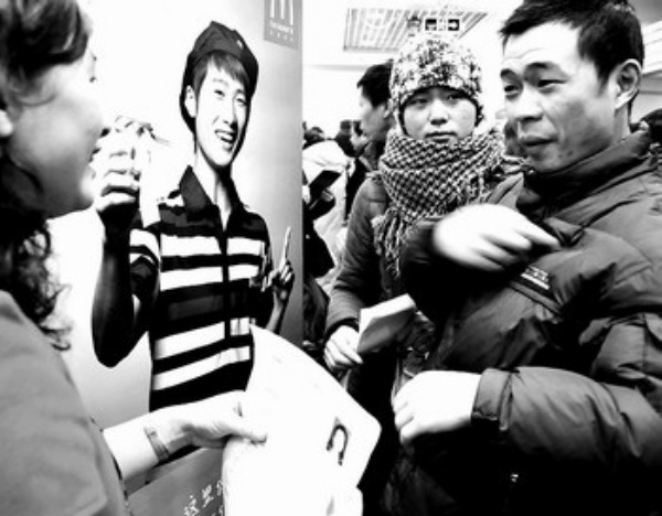 一名聋哑人(右一)在“就业援助月”首场招聘会现场与招聘人员交谈。 近日,北京2010年“就业援助月”首场招聘会举行,共有40多家单位参会,提供岗位1000余个,援助对象包括就业困难人员、零就业家庭人员、登记失业的残疾人等。 马海林摄(新华社发)