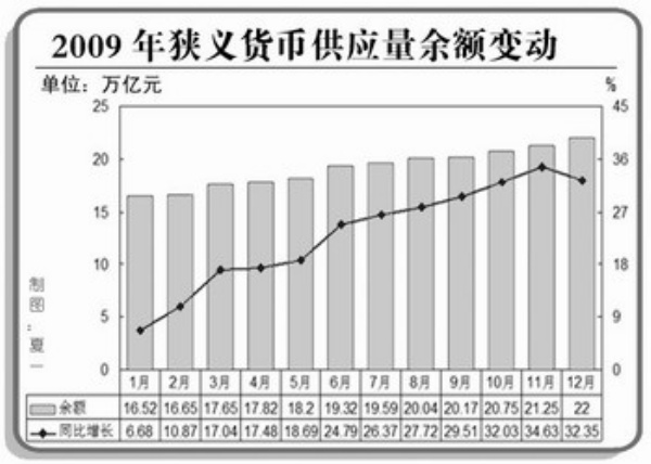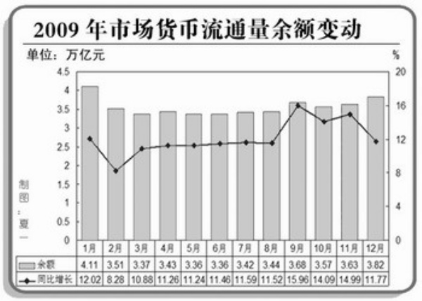 到2009年12月末,广义货币供应量余额为60.62万亿元,同比增长27.68%,增幅比上年末高9.86个百分点;狭义货币供应量余额为22.00万亿元,同比增长32.35%,增幅比上年末高23.29个百分点;货币流通量(M0)余额为3.82万亿元,同比增长11.77%。