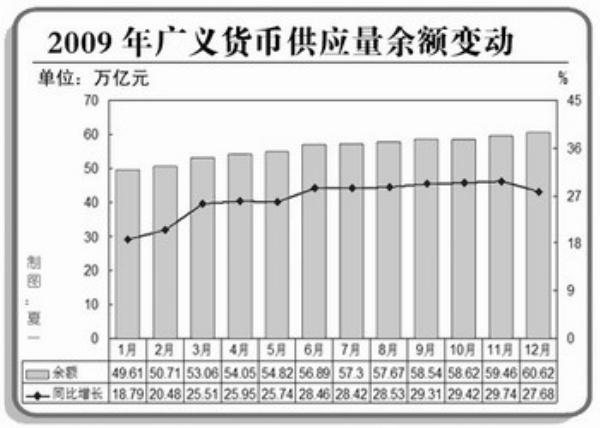 2009年12月末,广义货币供应量(M2)余额为60.62万亿元,同比增长27.68%,增幅比上年末高9.86个百分点。全年人民币各项贷款增加9.59万亿元,同比多增4.69万亿元。