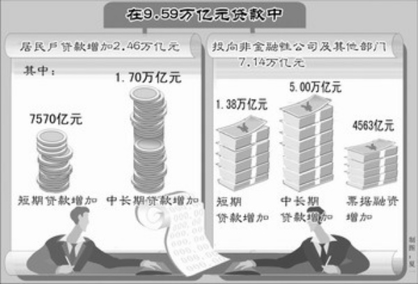 根据人民银行公布的统计数字,在9.59万亿元贷款中,居民户贷款增加2.46万亿元,其中,短期贷款增加7570亿元,中长期贷款增加1.70万亿元。而其余7.14万亿元贷款投向了非金融性公司及其他部门,其中短期贷款增加1.38万亿元,中长期贷款增加5.00万亿元,票据融资增加4563亿元。