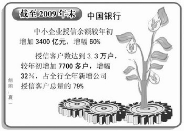 截至2009年底,中行中小企业授信余额较年初增加3400亿元,增幅60%;授信客户数达到3.3万户,较年初增加7700多户,增幅32%,占全行全年新增公司授信客户总量的79%。其中,小企业授信余额较年初增加1000亿元,增幅130%;授信客户数为1.7万户,较年初增加5500多户,增幅为50%,占全行全年新增公司授信客户总量的57%。此外,中行还发挥贸易融资、国际结算等业务专长,为中小企业提供大量信用证、保函等产品和服务,表内外授信近1.3万亿元。在“第二届中国中小企业融资论坛”评比活动中,中国银行“中银信贷工厂”获得“2009年最佳中国中小企业融资方案”奖。