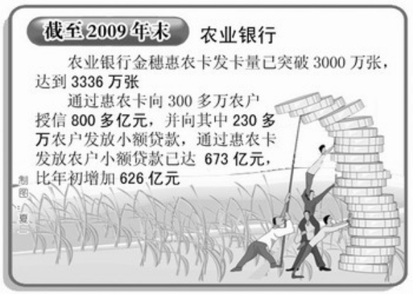 截至2009年底,农业银行金穗惠农卡发卡量已突破3000万张,达到3336万张;通过惠农卡向300多万农户授信800多亿元,并向其中230多万农户发放小额贷款,通过惠农卡发放农户小额贷款已达673亿元,比年初增加626亿元。这些数字意味着,农业银行在一年半的时间内,发放的农户贷款超过过去近30年农户贷款余额的一半以上。目前,惠农卡为全国1.6亿农民提供了现代金融服务。