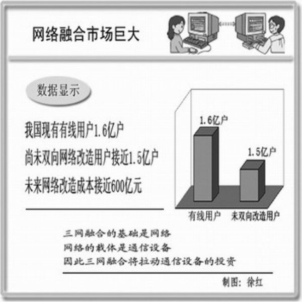 从通信设备企业来看,数据显示,中国现有有线用户1.6亿,尚未双向网络改造用户接近1.5亿户,未来网络改造成本接近600亿元。上述专家介绍,三网融合的基础是网络,而网络的载体就是通信设备,三网融合的加速将拉动通信设备的投资。