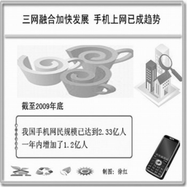 从我国实际情况来看,随着移动互联网的发展和3G建设的全面铺开,电信网和互联网的“二网融合”实际上已经完成,来自中国互联网络信息中心的数据显示,截至2009年底,中国手机网民规模一年内增加了1.2亿,已达到2.33亿人。而此次“三网融合方案”的重点,则是将广电网进一步纳入“融合”的范畴。