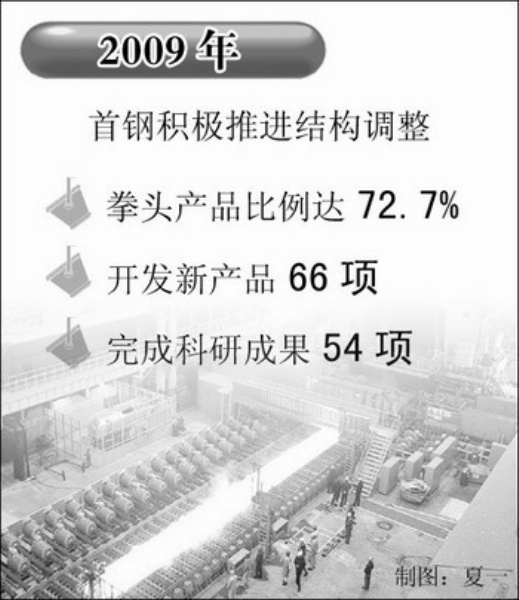 首钢总公司积极应对国际金融危机,深入挖潜增效,提高创新能力,推进结构调整,取得显著成效。2009年,钢铁业成本降低额达43.2亿元,拳头产品比例达72.7%,开发新产品66项。
