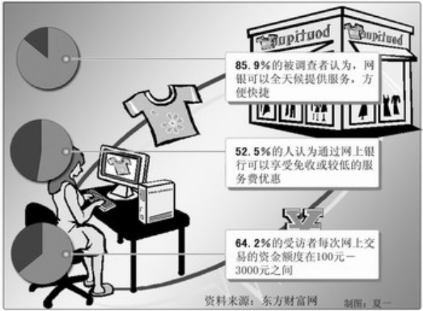 如今,像李松梅一样使用网银的人已经越来越多。现代人的生活、工作都与互联网紧密相关,在互联网提供的各种服务中,网上银行的发展已经进入高速发展时期。东方财富网《2009年中国网上银行调查报告》显示,汇款转账、购物支付和查询账户及交易记录是最常使用的网银服务,使用网银购买股票和购买基金的人也比较多,也有一部分人使用网银缴付各类费用和信用卡还款。而节约成本是开通网银服务的主要驱动力,85.9%的调查者认为,网银可以全天候提供服务,方便快捷;52.5%的人认为通过网上银行可以享受免收或较低的服务费优惠。但网上交易资金额度仍然较小,64.2%的受访者每次网上交易的资金额度在100元—3000元之间。