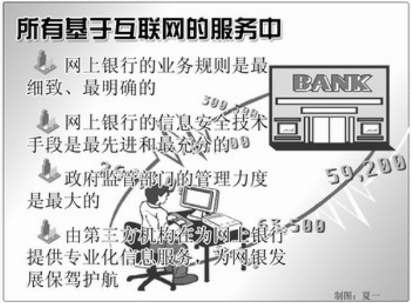 和李松梅想法类似的人很多,人们在享受网银高技术、高效率的同时,最关注的还是安全性。“网上银行信息安全是有充分保障的,安全是网上银行发展的一个基础。因为所有基于互联网的服务中,第一,网上银行的业务规则是最细致、最明确的;第二,网上银行的信息安全技术手段是最先进和最充分的;第三,政府监管部门的管理力度是最大的;第四,有像中国金融认证中心这样的专注网银信息安全第三方机构在为网上银行提供专业化信息服务,为网银发展保驾护航。网上银行之所以能够得到高速发展,有安全技术保障、有业务规则、有法律支撑,这些都是充分必要条件。”中国金融认证中心副总经理曹小青对网银安全很有自信。