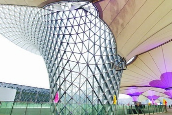 世博轴工程在世界上首次采用了超大规模“阳光谷”结构,6个远看如花儿怒放的巨型圆锥状结构,自然光透过“阳光谷”玻璃倾泻入地,可满足部分地下空间的采光需求并自然通风,提升地下空间的舒适感,节约大量能源。世博轴工程屋面顶棚采用的索膜结构,创造了一项世界之最。整个屋顶膜面外形如舒卷的白云,由31个外桅杆、19个内桅杆及牵引桅杆的各类钢索作为支承系统,整个屋顶膜面长约843米、最宽处约97米,膜面展开面积达7.7万平方米,为全球最大规模的索膜结构。世博轴工程采用了生态设计理念,除了“阳光谷”及下沉式草坡把阳光和绿色引入各层空间,还采用地源热泵、江水源热泵、雨水收集利用等新技术,引领当代建筑向绿色环保节能方向发展,体现了上海世博会“城市,让生活更美好”的主题。