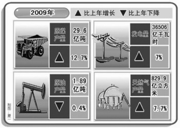 据统计,2009年全国原煤产量29.6亿吨,比上年增长12.7%。全年发电量36506亿千瓦时,增长7%;全社会用电量36430亿千瓦时,增长5.96%。原油产量1.89亿吨,下降0.4%;原油净进口1.99亿吨,增长13.6%。天然气产量829.9亿立方米,增长7.7%。