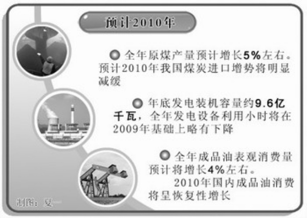 对于煤炭、电力和成品油消费,周喜安表示,全年原煤产量预计增长5%左右。2010年全球经济逐步复苏拉动煤炭需求增加,国际煤炭价格将保持目前的上升势头,预计2010年我国煤炭进口增势将明显减缓;用电量方面,预计2010年全社会用电量将呈“前高后低”的发展态势,电力消费弹性为1左右,年底发电装机容量约9.6亿千瓦,全年发电设备利用小时将在2009年基础上略有下降;全年成品油表观消费量预计将增长4%左右。2010年国内成品油消费将呈恢复性增长。由于全国将新增炼油能力2000万吨以上,加上地炼和社会资源,成品油市场总体仍将供大于求。