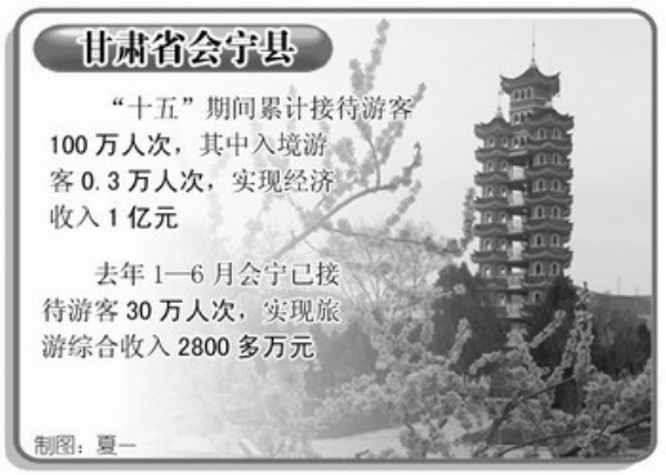 位于甘肃省中部的会宁县,以红军三大主力会师地而闻名遐迩,也因自然条件严酷而备受关注,是一个人口大县、农业大县。自2006年以来,红军会师旧址年接待游客20余万人次,实现经济收入3000万元。去年1—6月会宁已接待游客30万人次,实现旅游综合收入2800多万元,取得了良好的经济效益。