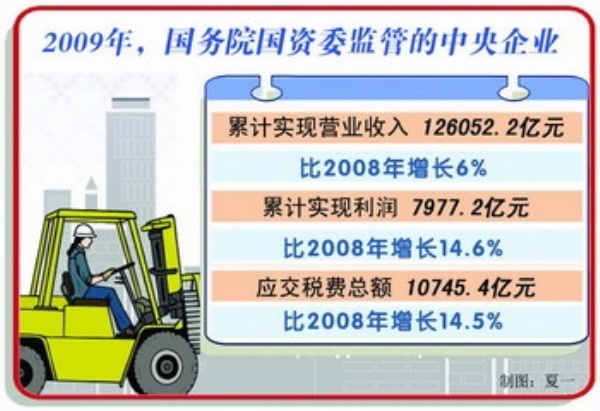 2009年,国务院国资委监管的中央企业累计实现营业收入126052.2亿元,比上年增长6%;累计实现利润7977.2亿元,比上年增长14.6%;应交税费总额10745.4亿元,比上年增长14.5%。去年年初确定的“资金链条不断裂、经营业绩不萎缩、现有市场不丢失、新的发展机会不错过、发挥主导作用不打折扣”的工作要求已基本实现。