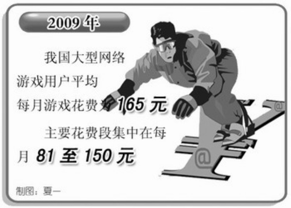 据中国互联网信息中心《2009年中国网络游戏市场研究报告》显示,我国大型网络游戏用户2009年平均每月游戏花费为165元,主要花费段集中在每月81至150元,用户比例为26.4%,30元以下用户比例次之,比例为22.4%,此外,高花费(每月500元以上)用户比例为4.4%。