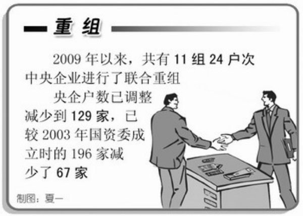 中央企业通过开展联合重组、整合主业板块、精简非主营业务等措施,加快资源整合,推进结构调整和优化升级。 2009年以来,共有11组24户次中央企业进行了联合重组,央企户数已调整减少到129家。中国农机院整体并入国机集团,实现了研发制造和贸易资源的有效结合。长沙矿研院和鲁矿集团整体并入中国五矿,为加快培育具有国际竞争力的大型矿业集团提供了支撑。