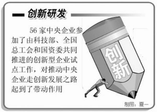 56家中央企业参加了由科技部、全国总工会和国资委共同推进的创新型企业试点工作,对推动中央企业走创新发展之路起到了带动作用。