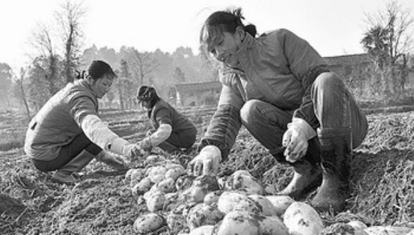 江西定南县引导农民调整农业产业结构,目前该县特色农业生产农户有5000多户,户平均年纯收入达2万多元。图为定南县车步村农民在采收从国外引入的秋种马铃薯。 刘念海摄 (中经网供图)