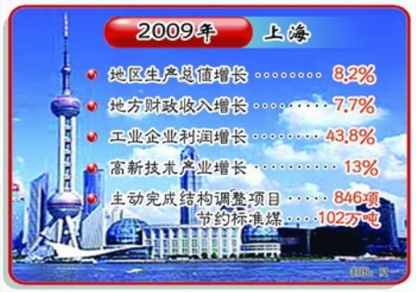 在这样的指导思想下,上海市经济实现了逆势中奋进,推进了危机中转型。初步统计显示,上海市2009年地区生产总值增长8.2%,地方财政收入增长7.7%。