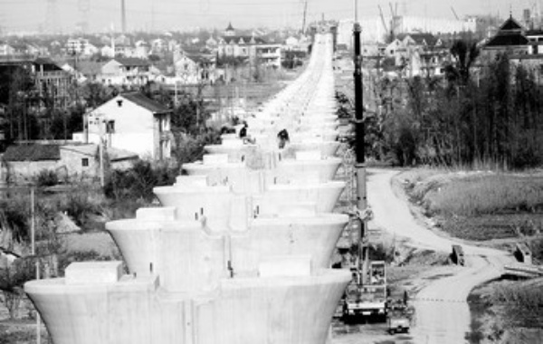 1月27日,在沪杭高铁嘉兴段,两名工人在高铁桥墩上进行架梁的准备工作。 自2009年9月沪杭铁路客运专线开始全线架梁以来,工程进展顺利,有望在2010年上海世博会期间投入运营。该线运营长度158.77公里,设计时速为350公里,建成后沪杭之间40分钟内可直达。 新华社记者 黄深钢摄