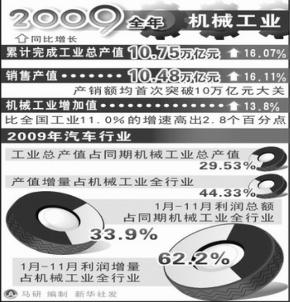 “在中央实施应对国际金融危机的一揽子计划后,‘保增长’的政策效果在机械行业较早显现,行业内主要经济指标逐月稳步回升。”中国机械工业联合会会长王瑞祥1月27日在接受记者采访时表示,2009年机械工业全年累计完成工业总产值和销售产值10.75万亿元、10.48万亿元。统计数据同时显示,2009年机械工业增加值比上年增长13.8%,比全国工业11.0%的增速高出2.8个百分点,为我国实现“保增长”的目标作出了突出贡献。