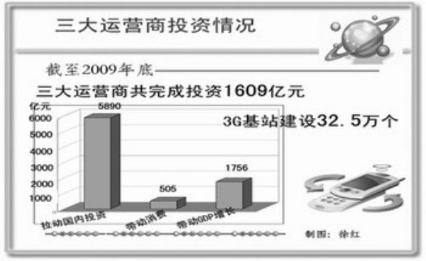 工业和信息化部的统计数据显示,截至2009年,我国三家运营商共完成投资1609亿元,完成3G基站建设32.5万个,国内3G用户总数超过1500万。