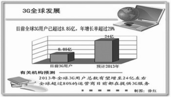 来自全球最权威的两家技术联盟GSA和CDG的综合数据显示,目前全球3G用户已超过8.85亿,年增长率超过29%,全球超过80%的运营商目前都在提供3G服务。英国咨询机构更预测2013年全球3G用户总数有望增至24亿左右。