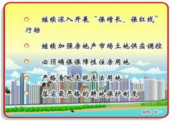 国土资源部部长徐绍史表示,今年国土资源部门将继续深入开展“保增长、保红线”行动,合理安排好新增建设用地计划,把握好土地调控节奏和力度,探索更加灵活的土地供应方式和弹性出让年期制度。土地供应绝对不能向“两高一资”、产能过剩和重复建设项目供地“开口子”。要严格控制新上项目供地,确保在建项目、重点项目和民生项目用地,特别是要优先保障战略性新兴产业和低碳产业用地需求。