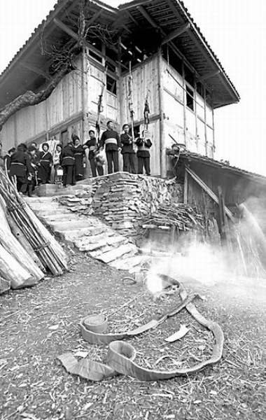 张里九在新居门前燃放鞭炮,庆祝喜迁新居(1月13日摄)。 贵州省黔东南州台江县方召乡危房改造户、苗族同胞张里九在政府的补助下修建好敞亮的苗家风格新居。 新华社记者 欧东衢摄