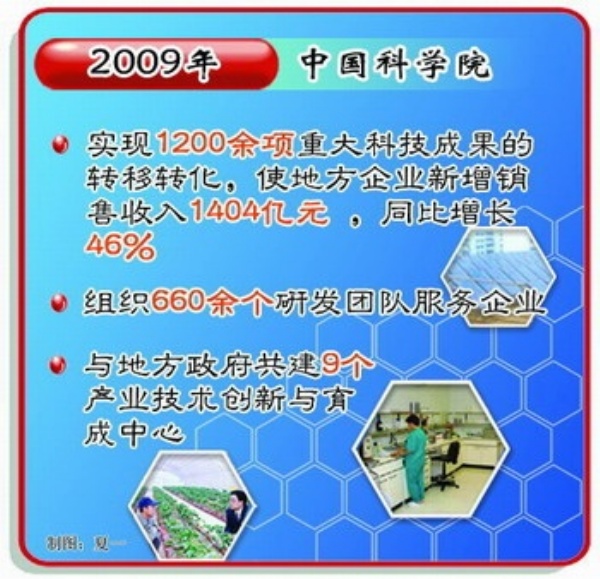 2009年,中科院有针对性地与企业开展合作研究与成果推广,重点关注对行业发展和技术进步有重大影响的技术成果转化,推广重大科技成果转移转化项目1203项。