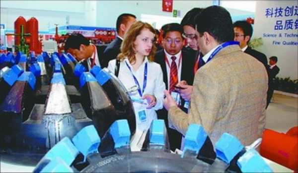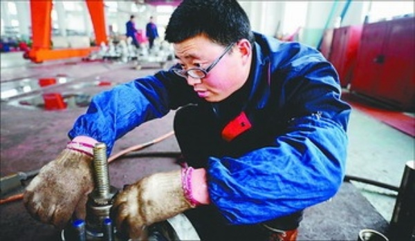 图2:建湖县鸿达阀门公司,工人在做产品检测。该县从为油田做阀门等小配件加工起步,使石油装备产业迅速崛起。