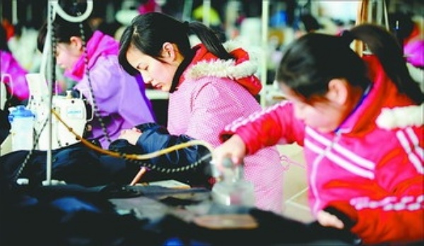 图4:建湖县玉人服装有限责任公司,车间女工正在加工训练服。该县纺织、服装业已初步形成一定的规模优势、市场优势和品牌优势。