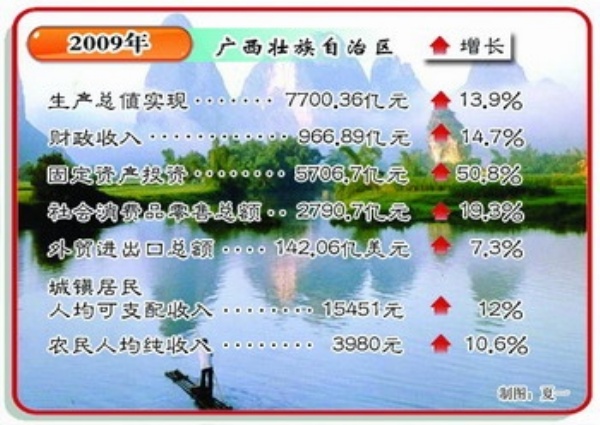李金早在发布会上介绍说,2009年广西应对国际金融危机取得明显成效。据初步核算,2009年地区生产总值实现7700.36亿元,同比增长13.9%,财政收入966.89亿元,增长14.7%。全社会固定资产投资完成5706.7亿元,增长50.8%;社会消费品零售总额实现2790.7亿元,增长19.3%;外贸进出口总额142.06亿美元,增长7.3%,其中出口总额83.7亿美元,增长13.9%;城镇居民人均可支配收入和农民人均纯收入分别达到15451元和3980元,分别实际增长12%和10.6%。