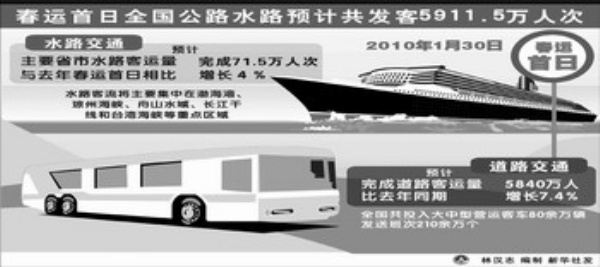 春运期间,全国道路运输将投入80余万辆大中型客车,平均每天发送的班次将达到210余万个;水上客运投入的船舶将达到2万艘,可以提供80万个客位。同时,交通运输部门还将加强组织调度,采取包车、增加班车、团体乘车等形式组织农民工返乡,并深入到厂矿、企业、院校以及其他一些旅客的集中地区,积极组织包车运输。