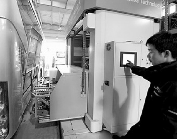 | 上图:工人正在操纵机器为纯电动公交车更换电池。目前,北京有100辆纯电动车和870辆油电混合动力车。2010年,北京将增加纯电动公交车至300辆。 新华社记者 李 文摄 |