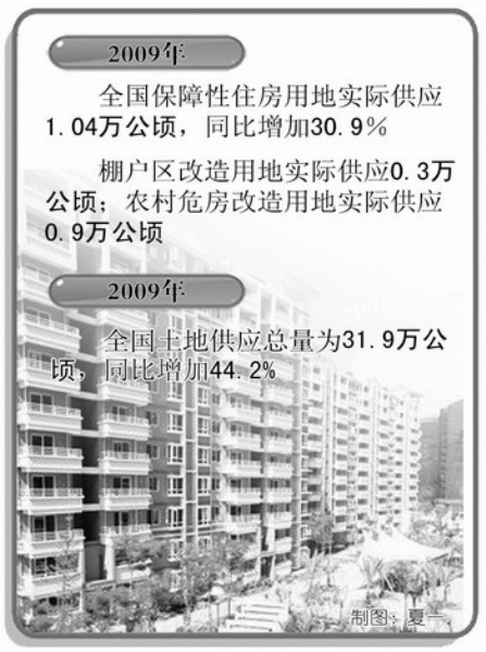 国土资源部土地利用管理司司长廖永林2日在国土资源部举行的新闻发布会上说,为全面落实中央关于保障性住房建设的总体要求,2009年,国土资源部通过增加指标总量、扩大指标流量、完善指标结构和提高审批效率等措施,保障民生用地。统计显示,全国31个省(区、市)和新疆生产建设兵团2009年保障性住房用地实际供应1.04万公顷,同比增加30.9%;棚户区改造用地实际供应0.3万公顷;农村危房改造用地实际供应0.9万公顷。