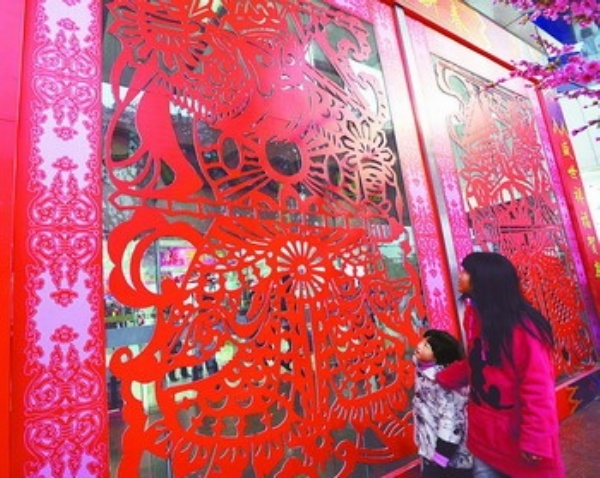 2月1日,两个孩子在合肥市步行街观看商场橱窗上粘贴的巨大窗花。春节临近,红彤彤的灯笼、红灿灿的中国结、红艳艳的对联等节庆饰品营造出浓浓的“年味”。 杨晓原摄(新华社发)