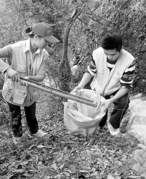 2月1日,志愿者在江西龙南武当镇风景区分捡垃圾。 为倡导游客低碳旅行,保护景区美好环境,江西省龙南县近日组织志愿者分赴当地景区,宣传低碳生活理念,号召游客文明旅游,以实际行动为低碳旅游“添砖加瓦”。 廖翠霞摄