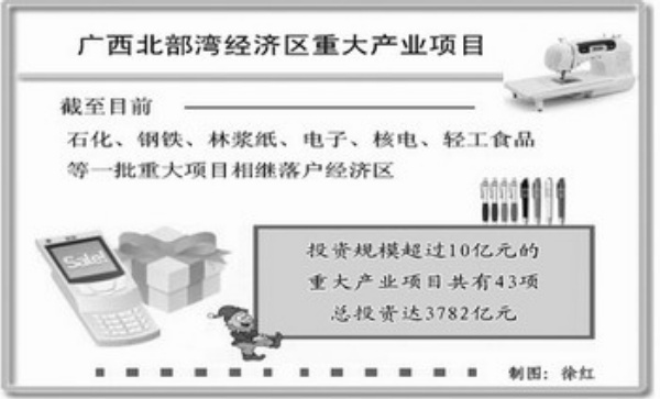 随着经济区建设的推进,广西临海产业布局正在加快形成。石化、钢铁、能源电力、林浆纸、电子等产业项目正在建设,产业链开始延伸。据统计,经济区内已落实投资规模超过10亿元的重大产业项目43项,总投资达3782亿元。其中,在建项目15项,总投资801亿元。