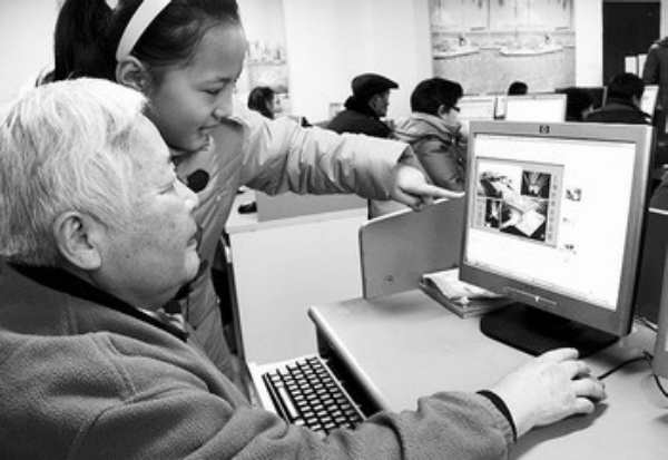 2月1日,江苏无锡市崇宁路小学红领巾世博宣传队的小队员在指导一位社区老人上网了解世博会信息。江苏省无锡市崇宁路社区开展“网上看世博”活动,小学生们组成红领巾世博宣传队,教社区里的老人们掌握上网方法,通过上网了解上海世博会相关信息。 (新华社发)