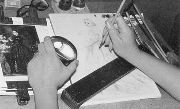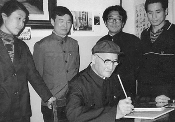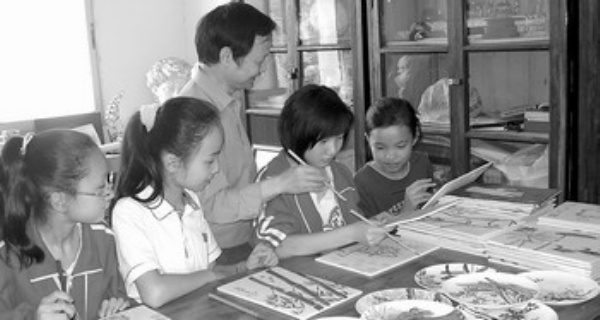 上世纪80年代,杨厚兴先生向学生们传授瓷版画绘制技艺。