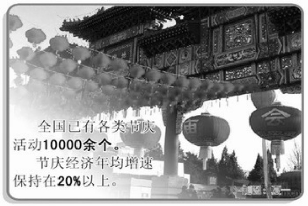 2009年元月,在第四届节庆产业年会上,中国城市经济学会城市节庆工作委员会主任朱立文向外界发布了一组数据:全国已有各类节庆活动7000余个,节庆总消费达到2450多亿元。