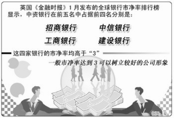 根据相关数据,截至2009年12月31日,全球前十大银行中有3家是中国的银行。中国工商银行以2689.82亿美元、中国建设银行以2014.55亿美元、中国银行以1539.72亿美元的市值位列前1、2、5位。在经历了国际金融危机的2009年,在国际大银行纷纷遭重创跌出排名前列的情况下,3家中资银行依然挺立在全球银行业前10名显得格外珍贵,它彰显了中国银行业改革的成功和中国金融实力的增强。 与市值同样骄人的另一个指标是市净率。英国《金融时报》1月发布的全球银行市净率(股价除以每股净资产)排行榜显示,中资银行在前5名中占据前4名,分别是招商银行、中信银行、工商银行和建设银行,这4家银行的市净率均高于“3”。市净率反映了在资本市场上,投资者对一家公司价值的认可程度,优质股票的市价都超出每股净资产许多,一般说来市净率达到3可以树立较好的公司形象。分析人士指出,2009年以来,中国各银行估值上升了一倍,西方银行的估值却有所下降。尽管中国各银行的估值曾在2008年因投资者的不安情绪而遭受冲击,但它们所受影响有限,再加上政府刺激措施的积极作用,它们的估值得以回升。