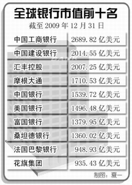 截至2009年12月31日,全球前十大银行中有三家是中国的银行。中国工商银行以2689.82亿美元、中国建设银行以2014.55亿美元、中国银行以1539.72亿美元的市值位列前1、2、5位。在经历过国际金融危机的2009年,3家中资银行依然挺立在全球银行业前10名显得格外珍贵,它彰显了中国银行业改革的成功和中国金融实力的增强。