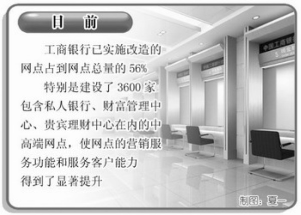 为给客户提供更加舒适的金融消费环境,近年来该行投入大量资金专项用于网点布局调整和装修改造,目前已实施改造的网点占到网点总量的56%,特别是建设了3600家包含私人银行、财富管理中心、贵宾理财中心在内的中高端网点,使网点的营销服务功能和服务客户能力得到了显著提升。 同时工行的电子银行服务渠道发展迅速,2009年电子银行交易额超过170万亿元,配备的ATM和自助设备超过5.6万台,每天仅通过ATM进行的交易就达到近1000万笔,目前工行的离柜业务量占比已经接近50%。