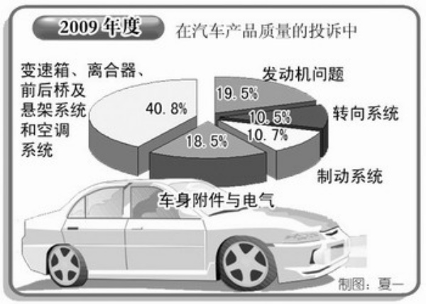 年度分析报告表明,相比2008年,2009年度汽车产品重要零部件相关的投诉有所下降,主要体现在发动机和变速箱方面,合计下降比例15%左右。