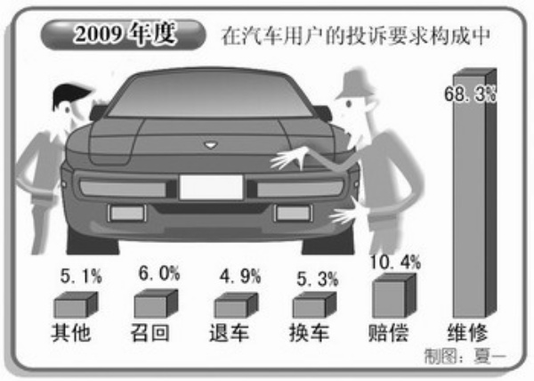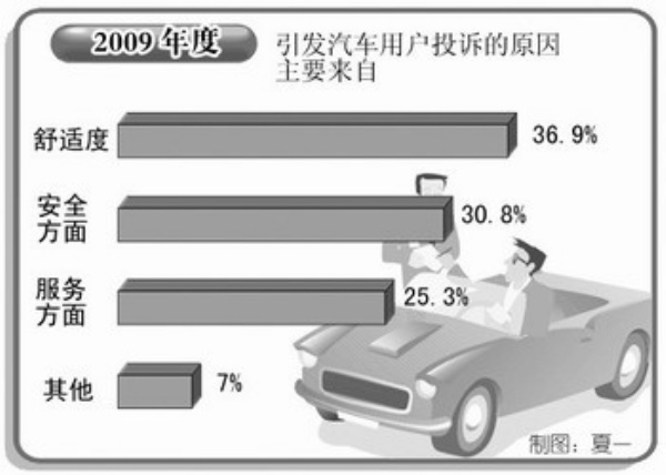 相比2008年,2009年投诉总量上升39.7%,其中,综合性投诉(同时有质量问题和服务问题)增加明显,但质量问题和服务问题单方面的投诉有一定程度的降低。说明汽车用户在关注产品质量的同时,对厂家服务水平尤其是服务站的服务水平要求越来越高。