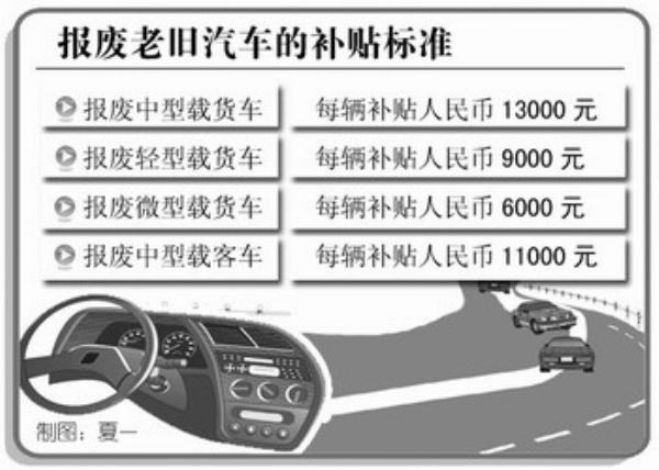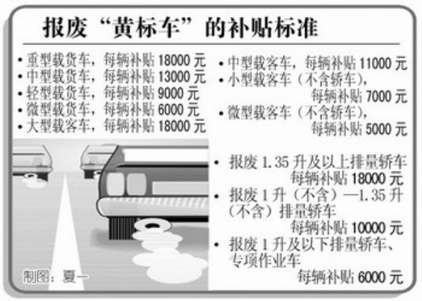 ◇ 提前报废老旧汽车、“黄标车”并换购新车的,补贴标准由3000元—6000元调整到5000元—1.8万元。