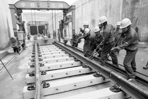 2月8日,在苏州轨道交通一号线木渎站轨道铺设现场,工人正在铺设轨排。这标志着苏州市轨道交通一号线进入轨道铺设阶段。苏州市轨道交通一号线全长约26公里,总投资126亿元,预计于今年底实现轨道贯通,2012年6月建成通车。 杭兴微摄 (新华社发)