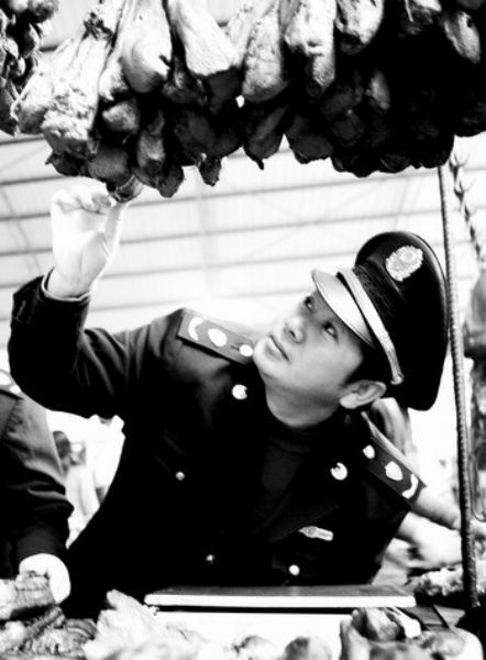 四川华蓥市工商执法人员正在农贸市场对腌腊制品进行检查。春节临近,各地监管部门加大了对节日重点消费产品的监管工作,确保产品质量,满足市场需求。 邱海鹰摄(中经网供图)