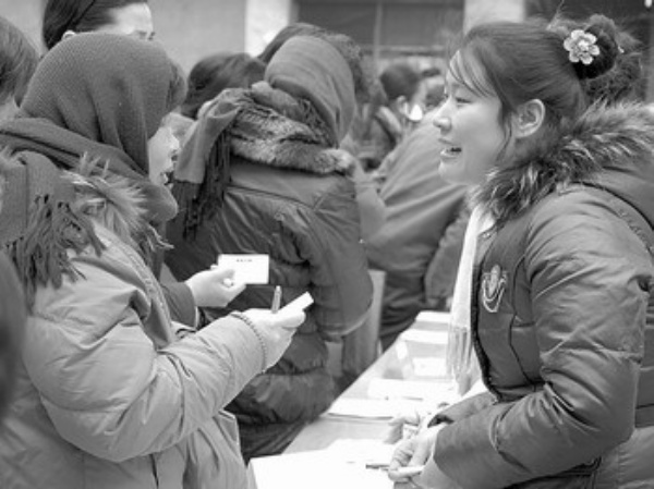近日,河南省南阳市卧龙区举办大型“4050”人员再就业供需见面会,现场提供了保洁、门卫、电工、钳工、焊工、加工、家政服务等42个工种1000多个公益性岗位,吸引了1500多名“4050”就业困难人员和下岗失业人员竞相前来应聘,招聘现场异常火爆。图为一名“4050”人员在招聘台前了解情况。 本报记者 王 伟 通讯员 熊运彬摄影报道