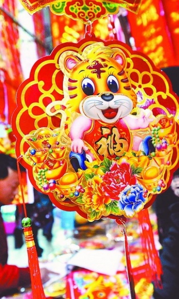 上图 2月12日,银川市民在一家市场选购虎年饰品。虎年春节临近,银川商家纷纷推出老虎挂历、年画、玩偶等饰品。